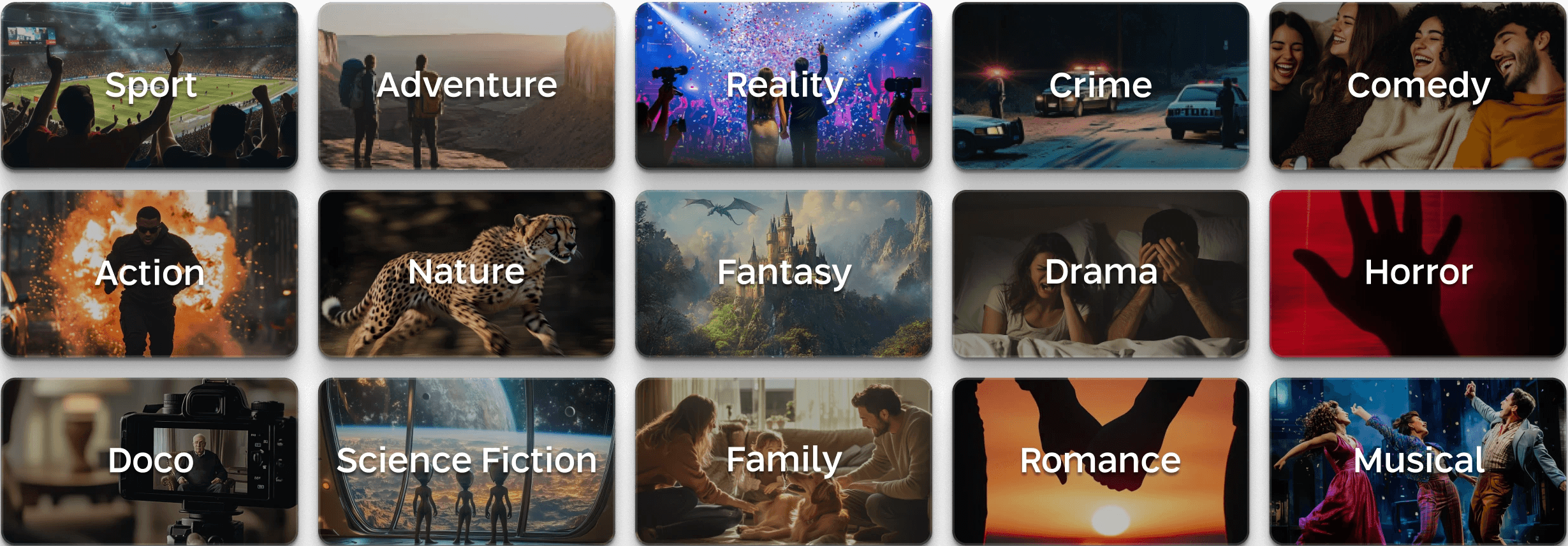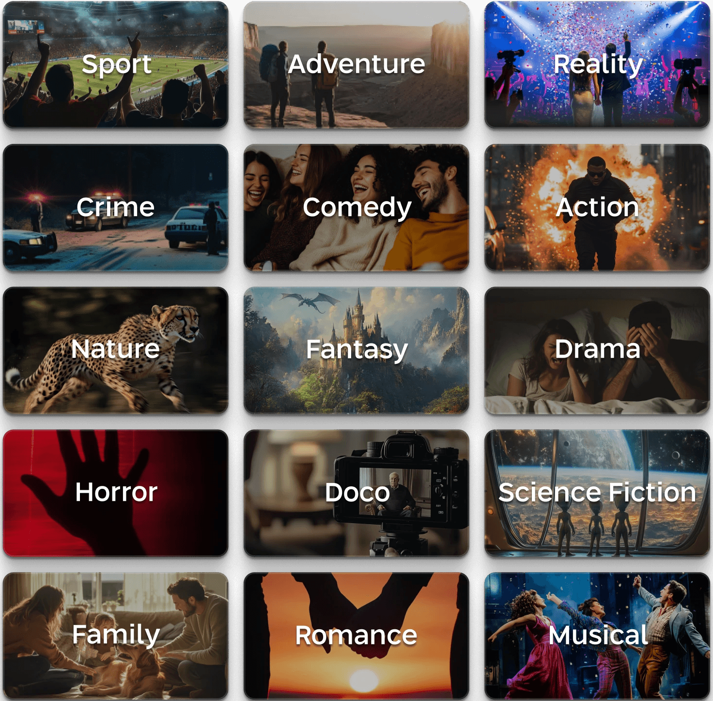 Midjourney was also used to generate original artwork for the interface, including custom visuals for the different content genres, helping establish a unique and cohesive visual language across the platform.